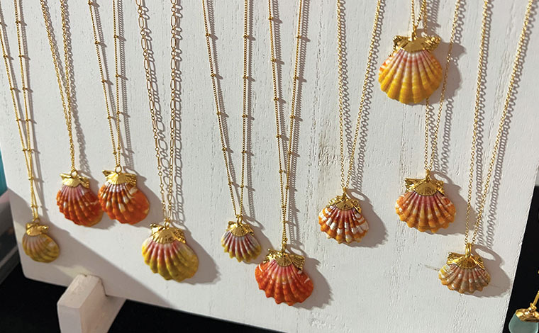 オーナーデザイナーのリサさんが、オアフ島の海辺で見つけたシーグラスや貝殻などから作るオリジナルジュエリー「Rise(ライズ)」。繊細な手作りジュエリーは、すべて一点物。希少価値の高い「Hawaiian Sunrise Shell(ハワイアン・サンライズシェル)」のネックレスはとくに人気。ひとつひとつ表情が違うので、お気に入りを見つけたらぜひ手に入れたい逸品です。