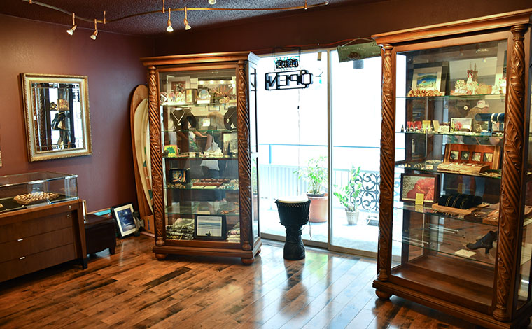 続いて、「レイレイ・ハワイアンジュエリー」は、デザイナー兼オーナーのジェームス氏がデザイン・制作するハンドメイド・ハワイアンジュエリー店です。アンティークな雰囲気の店内では、素敵なジュエリーが展示されています。店名の「レイレイ」は、ハワイでホテルなどのチェックイン時などにもらう「レイ」からだそうです。レイは人から想いを込めて渡されるように、ハワイアンジュエリーも母が娘に受け継がせるようにハワイの伝統を引き継いでいくという意味が込められています。