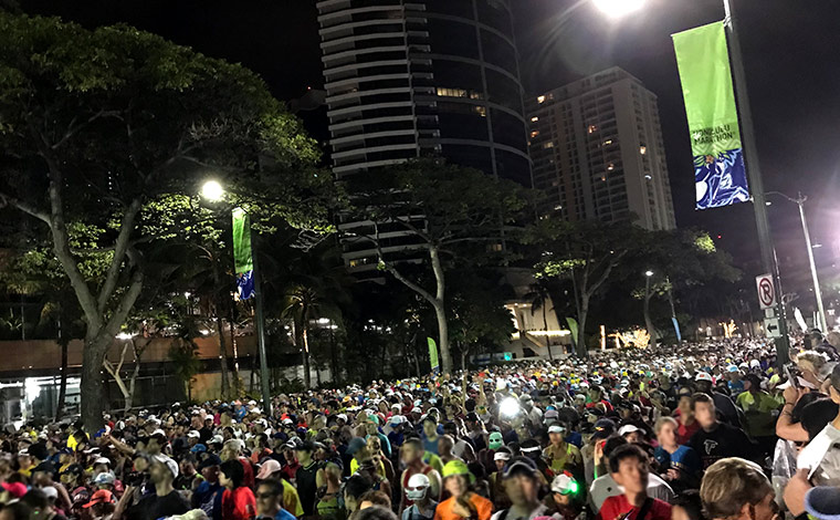フルマラソン、10kラン&ウォークともに、朝の5時に花火とともにスタート。フルマラソンでは、ときに海沿いを走り抜けてダイヤモンドヘッドを目指します。