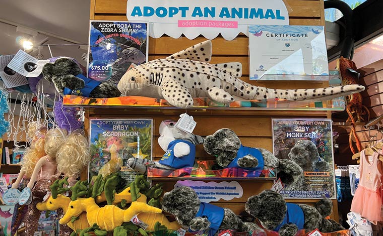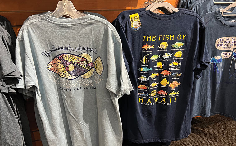 水族館ならではのお土産探しにぴったりの、ギフトショップもお見逃しなく。海の生物たちをモチーフとしたTシャツや絵本、ぬいぐるみなどを思い出に購入するのもよいでしょう。ここでしか入手できない「エモネモ」のぬいぐるみは特に大人気だそう。エモネモは、ワイキキ水族館にいるクマノミの一種。水族館のスタッフが「エネモネ」とニックネームを付けてかわいがっている魚です。またギフトショップの売上は、水族館の運営や魚たちの研究費用に充てられます。