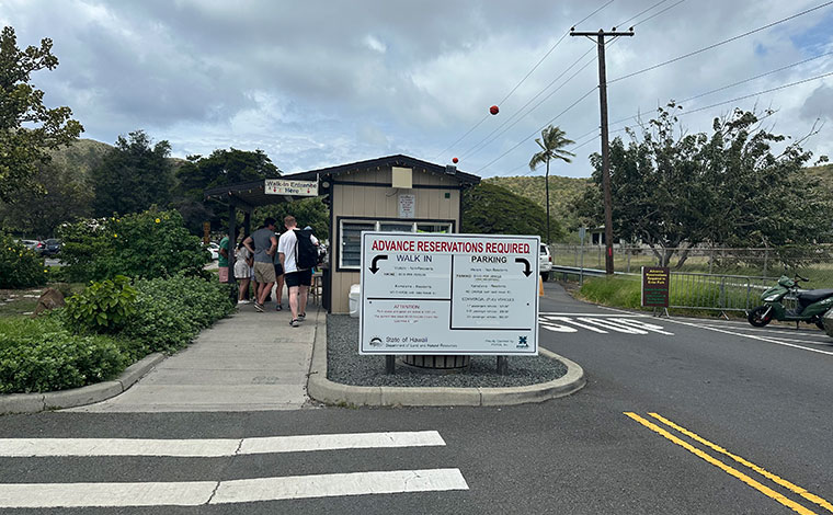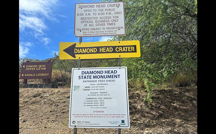 気軽に登れるダイヤモンドヘッドですが、2022年5月12日から観光客はウェブサイトでの事前予約が必須になりました。ここが、コロナ禍前とくらべて大きく変わったことです。入山時の混雑を緩和するために、導入されたシステムで訪問日の30日前から予約できます。入山料は、4歳以上1人5ドル。レンタカーなど個人の車で訪問する場合は、駐車代込みで1台10ドルです。ちなみに、ハワイ在住者は、ハワイ州のID、もしくは運転免許証を提示することで、事前予約は不要な上、無料で入山できます。観光客の皆さまは、ご予約の上、ご訪問ください。ダイヤモンドヘッドの入山前にも何度か、事前予約が必要なことが看板にも書かれています。