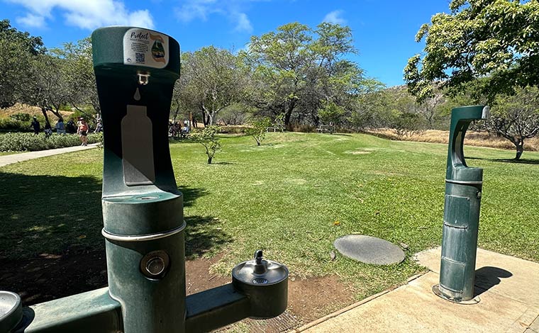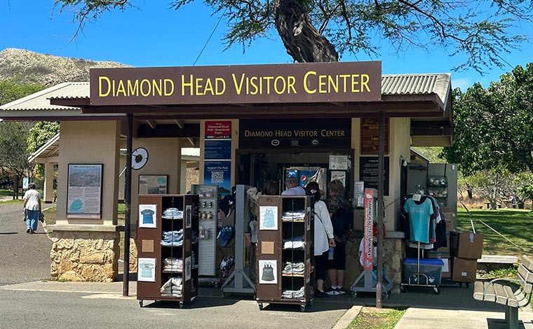 下山したら、ぜひビジターセンターをのぞいてみましょう。ここでは、ダイヤモンドヘッドのロゴグッズ(ハガキ、マグネット、ピンバッチ、ウォーターボトル、Tシャツなど)を販売しています。営業時間は、朝7時から午後3時30分まで。