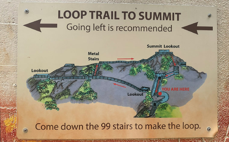 トンネルを抜けると、99段ある急こう配の階段とらせん階段という難関ルートが待ち受けています。でも、体力に自信がない方は、迂回ルートがあるので安心です。迂回ルートは、上のイラストの「You Are Here」の場所から左に進みます。こちらも階段ですが、景色を楽しみながら、手すりもある緩やかな階段なので、難関ルートに比べると少しだけ楽かもしれません。