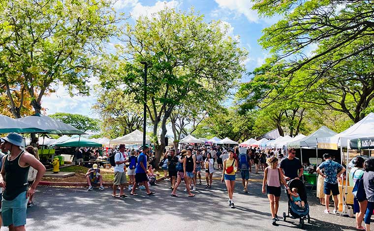 せっかくダイヤモンドヘッドまで訪れたので、一緒に立ち寄ってほしいのが、KCCファーマーズマーケットやモンサラットのエリア。KCCファーマーズマーケットは、毎週土曜日に、ダイヤモンドヘッド麓のカピオラニ・コミュニティ・カレッジ(KCC)の駐車場で開催されています。週に1度なので、ダイヤモンドヘッドのハイキングをこの日にあわせて行かれる方も多いです。