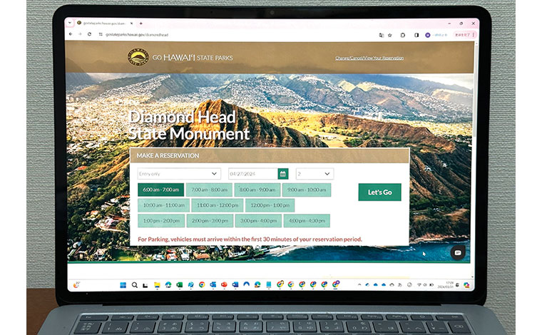ダイヤモンドヘッドの事前予約は、ハワイ州立公園を管理している公式サイト(https://dlnr.hawaii.gov/dsp/parks/oahu/diamond-head-state-monument/)から行います。ウェブサイトは英語のみですが、予約方法は比較的簡単なのでご安心を。なお、予約入力には、30分という時間制限があり、制限時間が経つと、始めからやり直しとなるので気を付けてください。