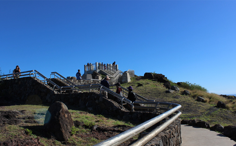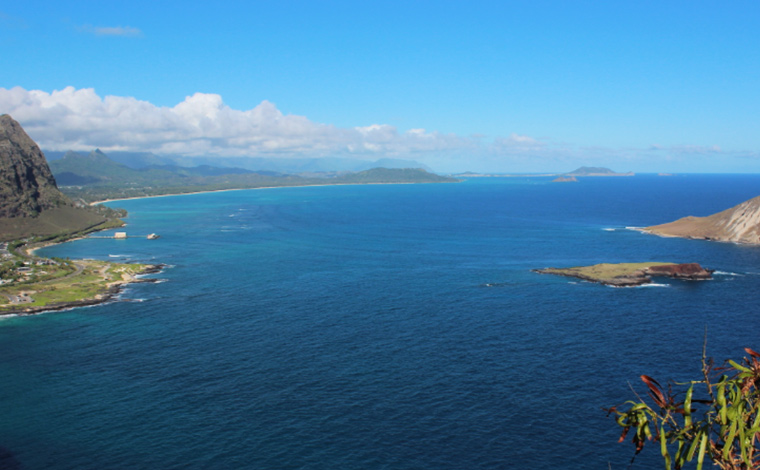 展望台からは、深い青色が美しい広大な海や迫力たっぷりの美しい山々、ラビットアイランドと呼ばれる島やカイルア方面の様子などが見渡せ、達成感もひとしおです。