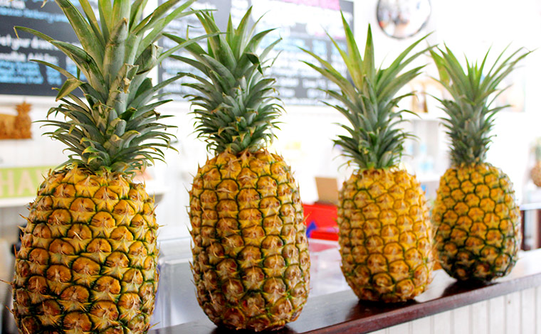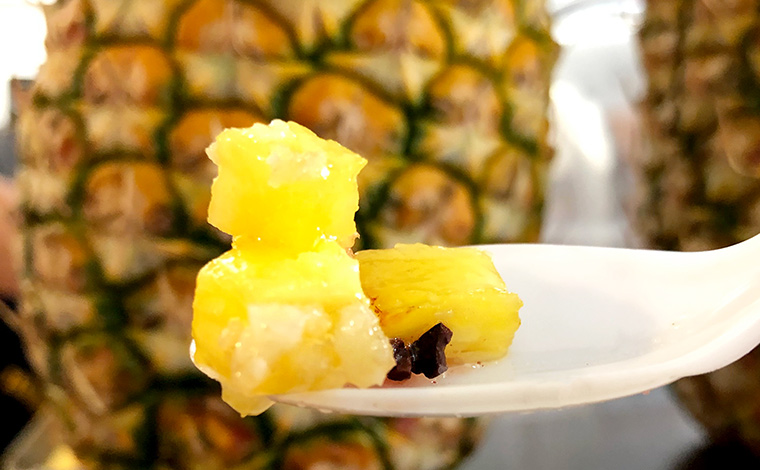 細かめにカットされたパイナップルがたっぷり乗っているのがこのカフェの特徴。このパイナップルこそ、自社農園から届く完熟のSweet Goldなんです。