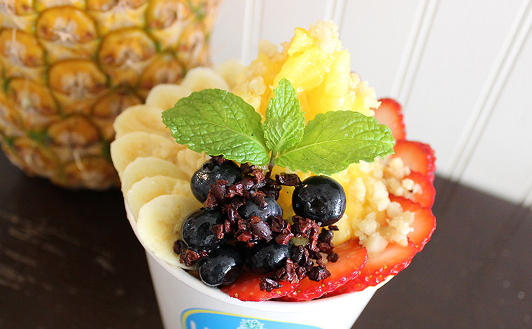 パイナップルのちょうどいい甘酸っぱさとハワイ島産の優しいはちみつの風味が絶妙!スーパーフードとも呼ばれる注目の「カカオニブ」ものっています。