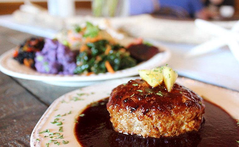 ごはんか玄米ごはん、もしくはオーガニックのグリーンサラダも選べます。ちなみにハンバーグのお肉はオアフ島とハワイ島で育った豚肉&牛肉の合い挽きですが、ベジタリアンハンバーグもあります。