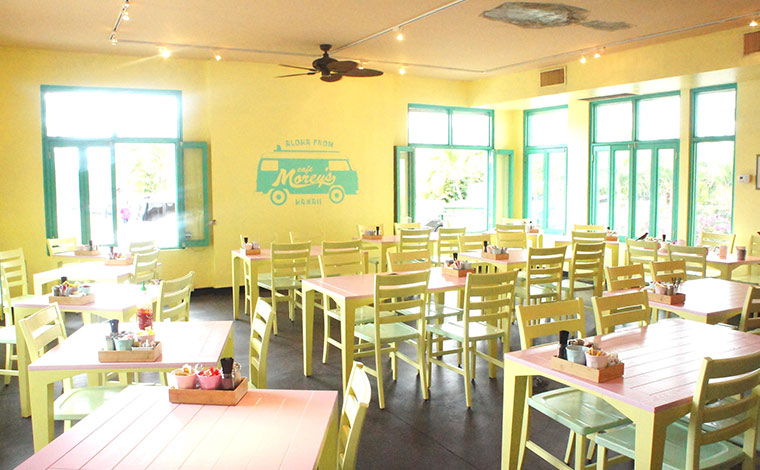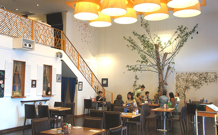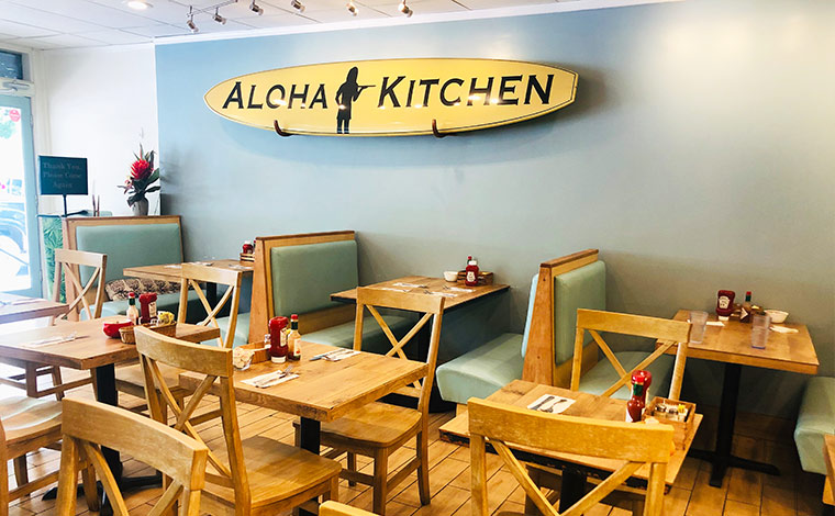日本でも大人気のAloha Kitchen(アロハ・キッチン)。お店の扉をくぐると、海をイメージさせるブルーグレーを基調とした壁とサーフボードが目に飛び込んできます。