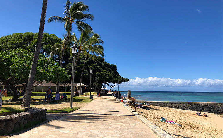 カラカウア通りから続く、クィーンズ・ビーチすぐ横の遊歩道なら、波音を聞きながら歩けるので気分も最高!公園から見えるダイヤモンドヘッドの堂々とした姿は、つい写真を撮りたくなるフォトジェニックな絶景です。