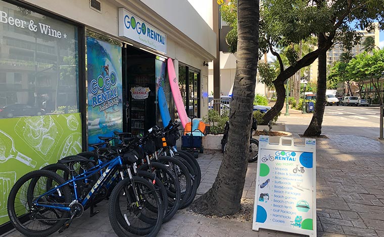 自転車は、現地で簡単に借りることができます。クヒオ通り沿いにある「GOGOレンタル」なら、普通の自転車のほか「電動アシスト自転車(Pedal Assist E-Bike)」もあり、とっても楽に運転できます。最短2時間から借りられますが、24時間でレンタルしておけば早朝好きな時間から利用できるので便利です。タイムシェアなどで長期滞在されている場合は、1週間単位でのレンタルもおすすめ! 自転車をスマートに乗りこなして、暮らすようにハワイ旅行を満喫できます。