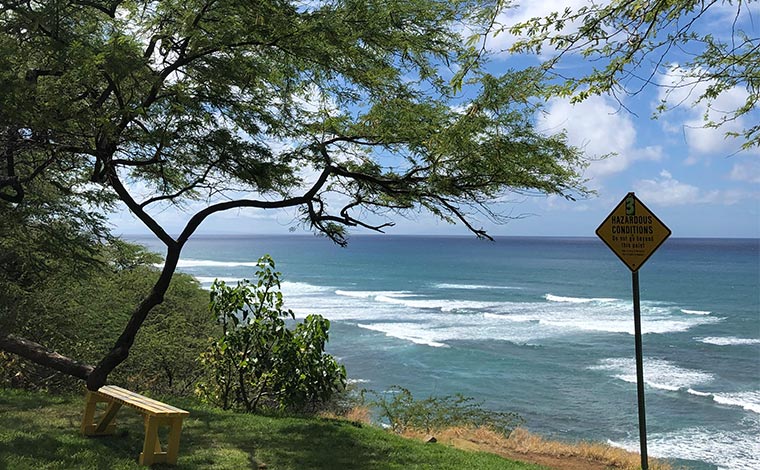 逆に東へ足を伸ばし、カハラ方面へのサイクリングをすると、また気分が変わります。ダイヤモンドヘッドの外側は少し上り坂ですが、途中の展望スポットからは眼下に広がる海が見られます。