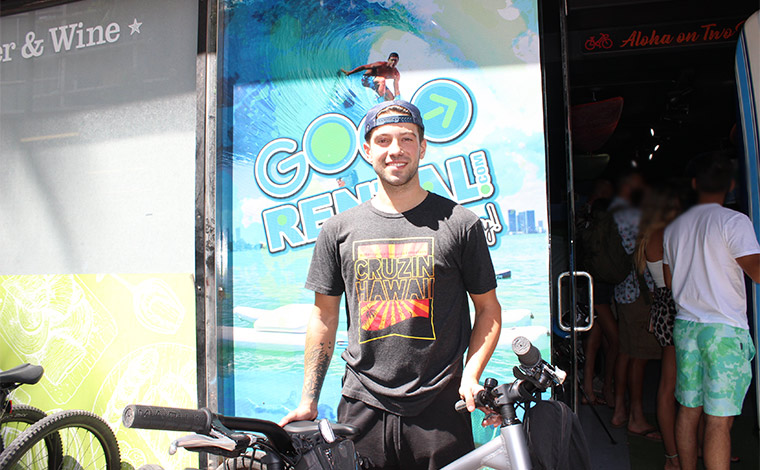 日本語で「ハワイでの自転車の乗り方」が書かれたパンフレットや、おすすめのサイクリングマップ(英語)なども用意されているのも親切。マネージャーのニックさん(写真)をはじめ、フレンドリーなスタッフが丁寧に対応してくれます。