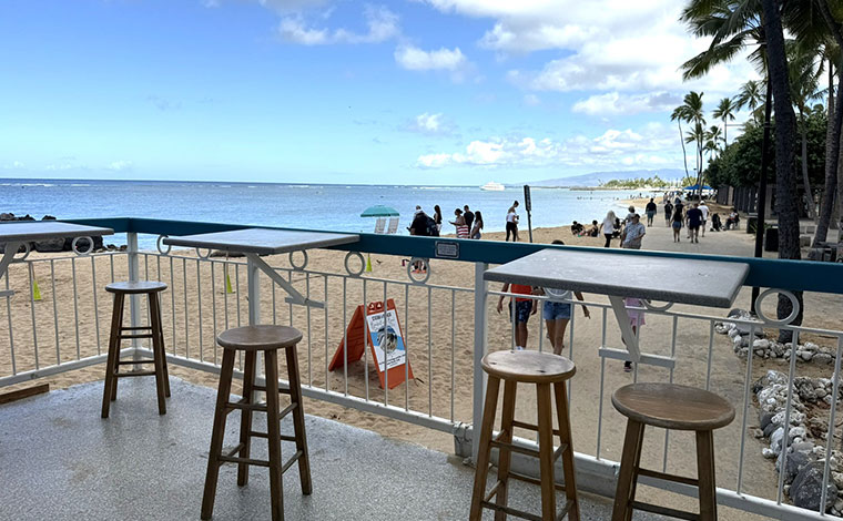 店舗で購入した料理は、すべてワイキキビーチ沿いのテラス席で食べられます。潮風を感じながら絶景を堪能できる開放的なテラスも魅力です。時間帯によっては直射日光が差し込むため、日陰の席を選ぶとより快適に過ごせます。美しいワイキキビーチを眺めながら味わうステーキは格別です。なお、ステーキシャックはテイクアウトがメインなので、お部屋のラナイなどでゆっくり楽しむのもおすすめ。ローカルはもちろん、ハワイ通のリピーターにも長年愛され続けている名店です。