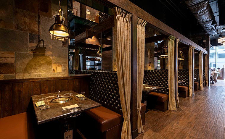 開放的な店内は、シックでモダンなデザイン。天井が高く開放感があり、ボックス席や半個室も完備されているため、少人数からグループまでゆったりと食事を楽しめます。入り口近くにはバーも併設されているので、快適な待ち時間を過ごせます。