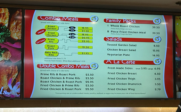 フライドチキンは、2ピース(18.95ドル)もしくは3ピース(20.95ドル)から選べ、サイドメニューを3つから選択できます。他にもホールローストチキン(39.5ドル)や単品サラダ、アラカルトでフライドチキンウィング(2.79ドル)などもあります。