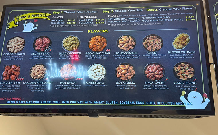 観光客がアクセスしやすいワイキキショッピングプラザ内にあります。チキンはハーフ(ウィング9本もしくは骨なし10個)19.99ドルか、フルのウィング18本もしくは骨なし20個33.99ドルです。数種類あるソースから選べます。メニューに迷ったら、お店のおすすめ「ゴールデンフライド」「ハニーガーリック」「ソイガーリック」から選ぶとよいでしょう。