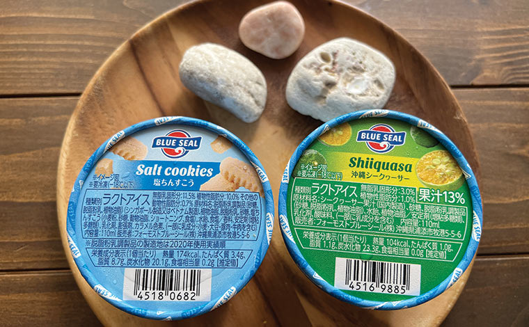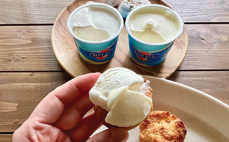 このようにアイスを挟んでかぶりつく豪快な食べ方のほか、アフタヌーンティーのスコーンのように、スプーンで少しずつアイスクリームを添えながら食べるのもおすすめです。いろいろと試した中で「最高においしい!」と感じたのは、ほのかに塩気のあるふんわりバニラの「塩ちんすこう」と、キュッと甘酸っぱくて爽やかな「沖縄シークヮーサー」。スプーンが止まらなくなる、とっておきの味わいです。