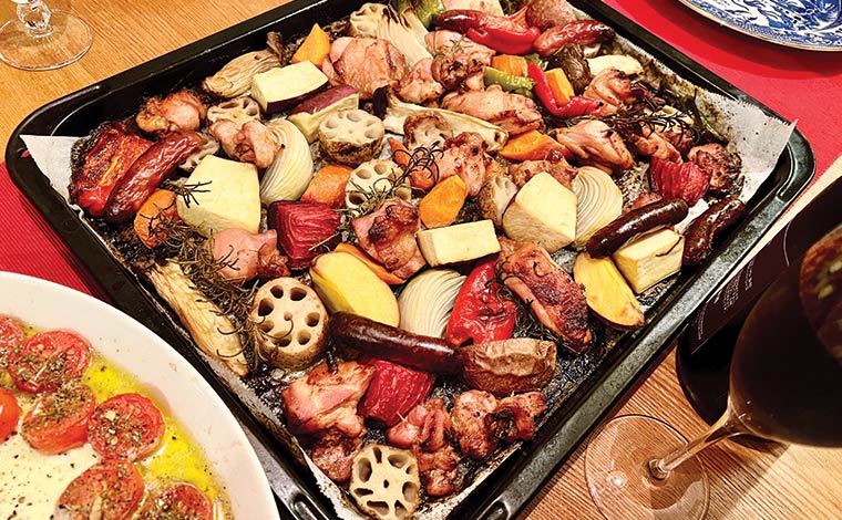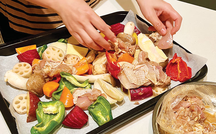 3)オーブンの天板にオーブンシートを敷き、漬けこんだ鶏肉と野菜を隙間なくぎっしりと並べる。鶏肉は汁気を切りながら、合間にソーセージも入れる。180℃に予熱したオーブンで40分焼けば出来上がり。