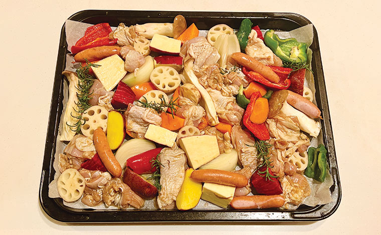 焼き上がったら大皿に並べ直してもよし、豪快に天板ごと出してもよし。色とりどり、どれから食べよう!?と歓声が上がること間違いなしです。ちなみに、ソーセージは下味なしでもじっくり焼くことでサクサクの新食感に。とてもおいしいので、ぜひ入れてみてくださいね。