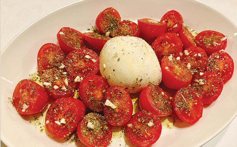 2)耐熱皿の中央にチーズを置き、トマトの切り口を上にして並べ、塩、胡椒、ドライハーブを振りかけ、にんにくを散らす。