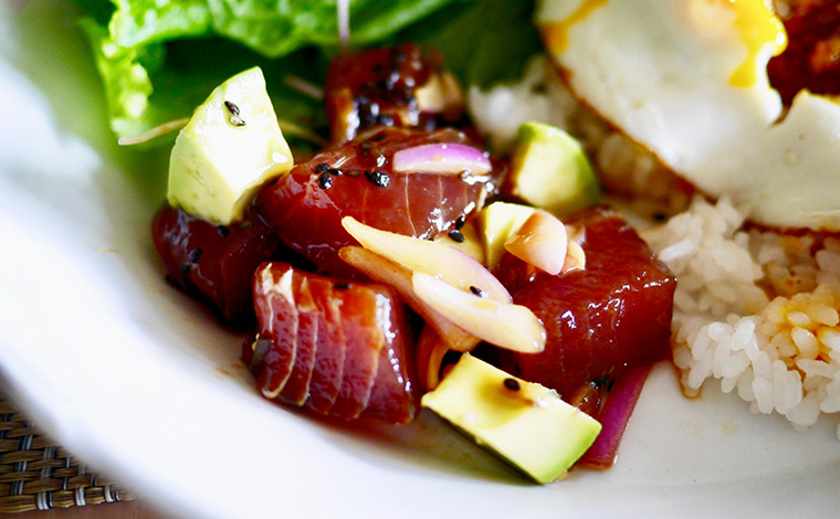 ハワイ諸島近海で獲れる新鮮なマグロで作るアヒポケ。古代ハワイから現代に至るまで親しまれている伝統料理です。ハワイ語でアヒはマグロ、ポケは角切りという意味。冷凍技術が発達していない時代は塩漬けにして保存性を高めたそうで、近年、それが醤油漬け(いわゆる〝ヅケ〟)に変化し、さまざまなバリエーションが生まれました。