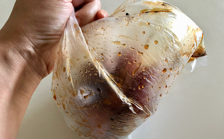 02 ポリ袋にたれの材料を入れて振り混ぜ、01を加える。袋をふくらませて、揉み込まないようゆっくりと振って絡める。冷蔵庫で10分以上冷やしていただく。