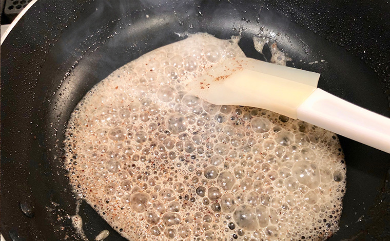 03 肉汁の残ったフライパンにバターを溶かし、小麦粉を加えて炒める。粒子が広がって泡立ったら、おろししょうが、しょうゆ、みりんを加えて沸騰させ、とろりとするまで煮つめる。