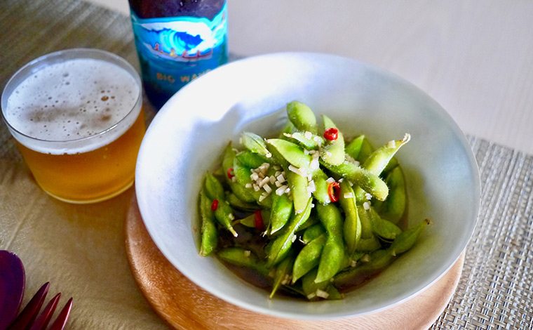 アヒポケとロコモコ、生野菜を盛り合わせてメインプレートが完成! おつまみにあともう1品、というときに、あるとうれしいのがガーリック枝豆。前もって作っておくと味がしみていっそうおいしい。作り方は、これまた簡単。