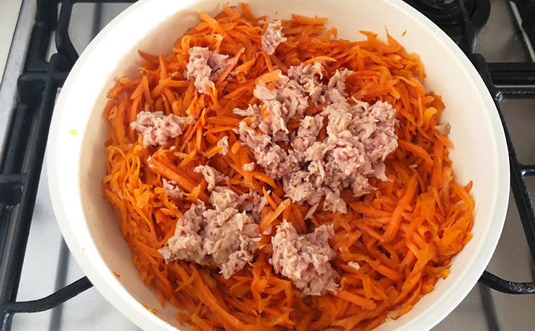 01 にんじんは皮ごとすりおろす。ツナ缶は缶汁を軽く切っておく。