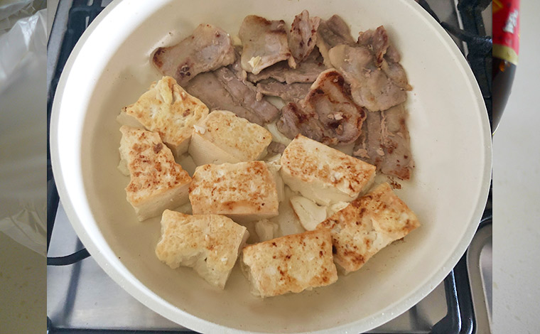 02 フライパンに1の豚肉を並べ、中火にかける。じわじわと脂が出るように火加減を調節しながら焼き、端に寄せ、空いたところに豆腐を大きめにちぎって入れる。豚の脂で豆腐の全面をじっくりと焼き付ける。