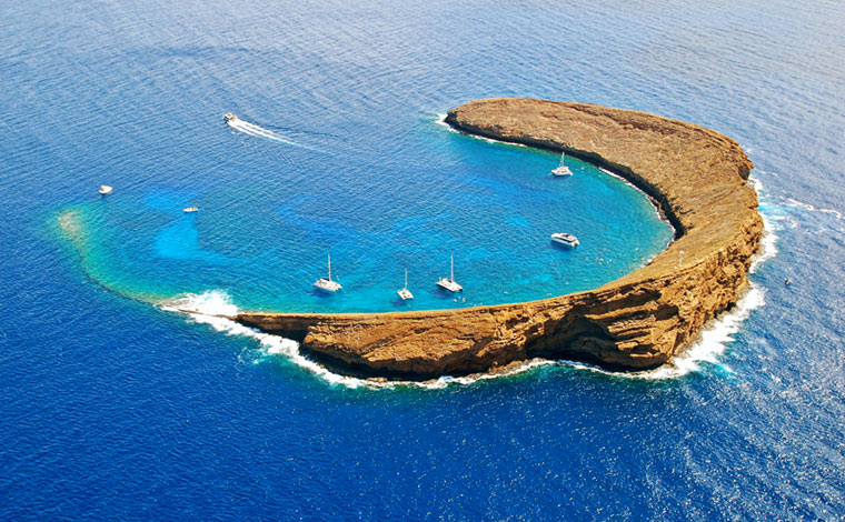 三日月形をしたモロキニ島は、昔の火山が沈下して火口の一部だけが海上に残った島です。島全体と沿岸の海がハワイ州の自然保護区に指定されており、アクセスには制限がありますが、州の認可を得ているエコツアーのボートが出ています。