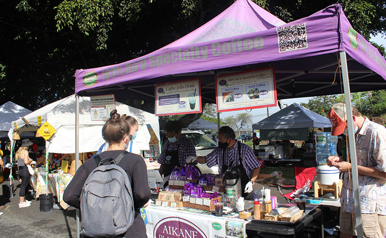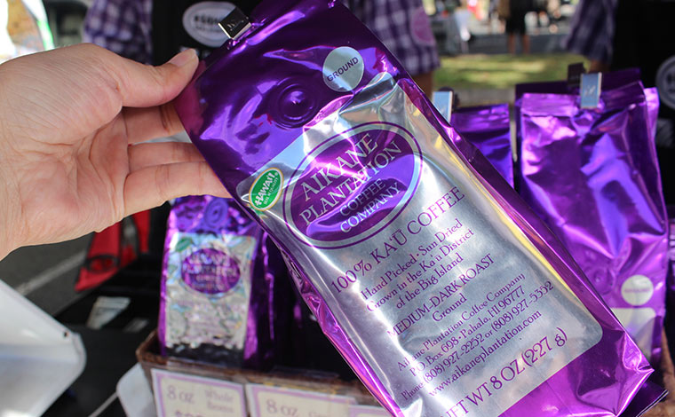 紫色のテントが目印の「アイカネ・プランテーション」では、ハワイ島のカウエリアにある農場で手摘みされたカウコーヒーを販売。