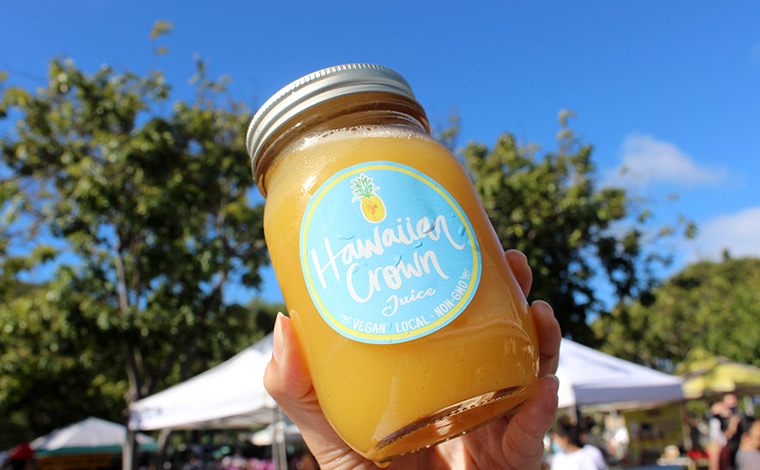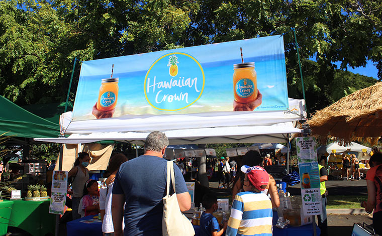 ワイキキにカフェを構える「ハワイアン・クラウン」のブースでは、メイド・イン・ハワイのパイナップルをたっぷりに使ったジュースをどうぞ。
