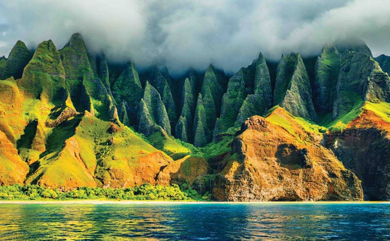 ハワイで最も北に位置し、最も早い時代に誕生したとされるカウアイ島。この島にも緑豊かな森が茂り、「ガーデンアイランド」という愛称にふさわしい景観が広がっています。風雨による侵食でできた海沿いの断崖、見る者を圧倒する峻厳な山々、エメラルドカラーにきらめく大渓谷、豊富な水量を持つ滝や川といった自然の造形美が、まるで神が創りたもうた庭園のような趣と神秘性をこの島に与えています。