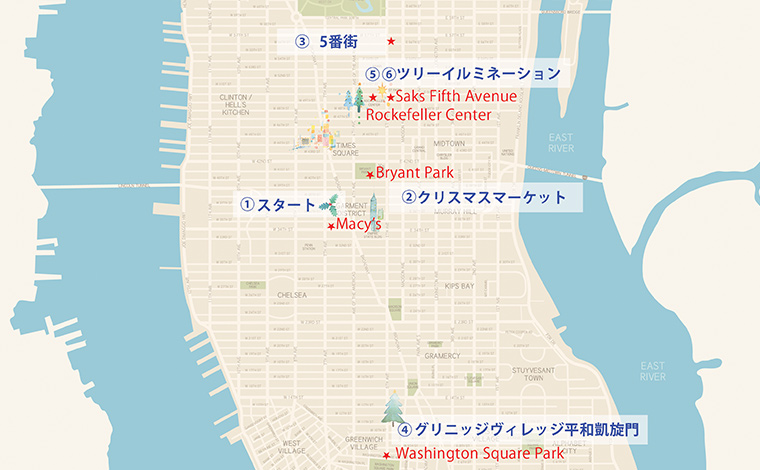 メイシーズからゆっくり歩いて約10分。ブライアントパークでは毎年恒例のクリスマスマーケットが開催されます。小さな店がたくさん並ぶクリスマスマーケットは、店をのぞいて歩くだけでも楽しく、クリスマス気分を盛り上げます。