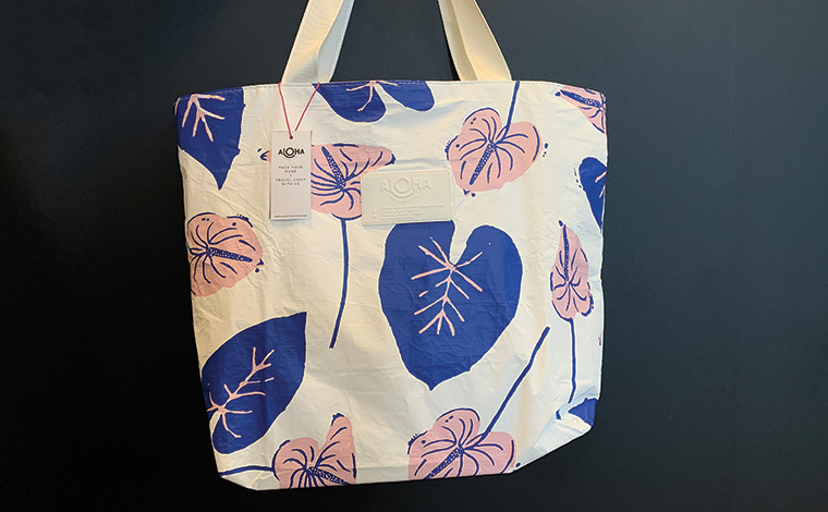 ハワイらしいアロハ柄のトートバッグは、ロイヤル・ハワイアン・センター店限定。日によっては、開店前の早朝から行列ができることもあるほどの人気です。