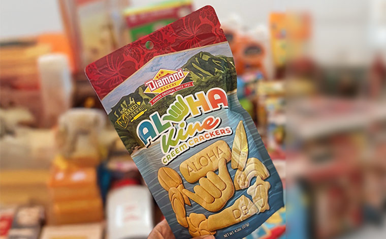 ダイヤモンドベーカリーのロイヤルクリームクラッカーの新商品 アロハカイン・クリームクラッカー。ハワイらしいモチーフのシャカサイン、ビーチサンダル、シェイブアイスなど、遊び心溢れたデザインのクラッカーです。食べるのがもったいないくらいかわいいのもポイント。