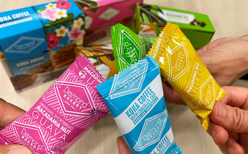今回は、ハワイアンマカダミアショートブレッドクッキーの、チョコレートチップ、グアバ、リリコイ、コナコーヒー、ウベと新発売のアロハカイン・クリームクラッカーをご紹介します。