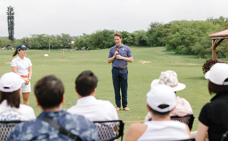 続けて「今年も新しくヒルトングランドバケーションズのアンバサダーに就任した畑岡奈紗選手を迎え、畑岡選手がメンバー様とどんなことをされたいか話し合った結果、今回のゴルフクリニックがハワイで実現したこと」をマーク・ワンが語りました。