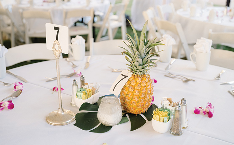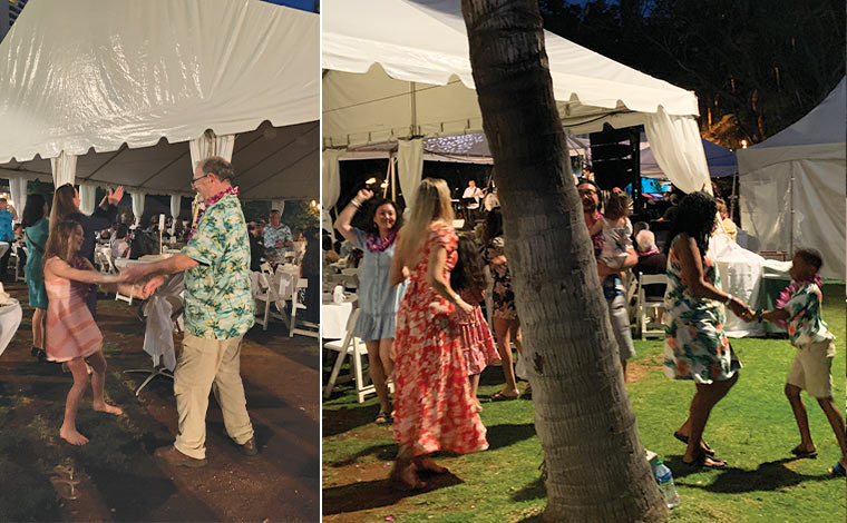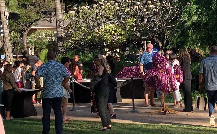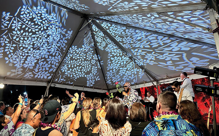 入口でレイをかけてメンバー様とゲストの皆様をお出迎え。HGVアルティメットアクセスのロゴが描かれたパネルの前で記念撮影を行いました。その後、大きなテントが張られたテーブル席にご案内します。ステージまでの距離も近く、ディナーショーならではの、演者と観客が一体となれるライブが楽しめそうで、期待も高まります。