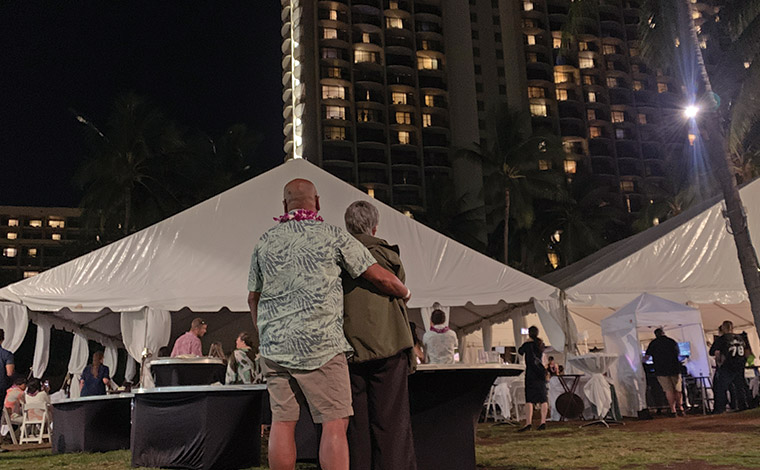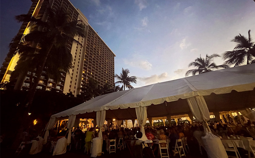 ディナーショーが開催されたのは、ヒルトン・ハワイアン・ビレッジ・ワイキキ・ビーチ・リゾート内にある芝生のグレートローン。ラグーンタワー・ヒルトングランドバケーションズクラブに隣接し、会場の海側はラグーンになっています。開場は午後5時半で、日没までまだ1時間以上あるため、夕方の日差しがまぶしいくらいでした。ラグーンから心地よい風を感じながら待つことしばし。
