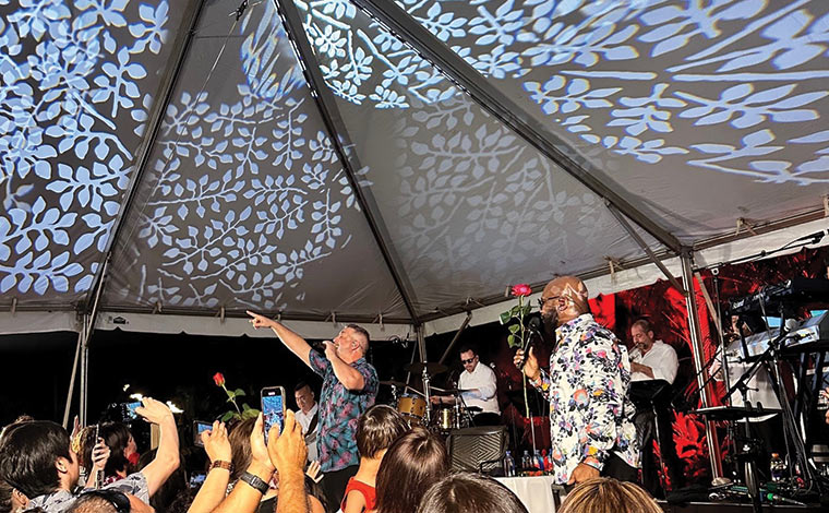 太陽が海岸線を赤く染める頃、いよいよショーのスタートです。ホーンセクションが音に重厚感を与えています。最初はテーブル席で聴いていたメンバー様やゲスト様も90年代にヒットチャートをにぎわした両グループの名曲に合わせて、ステージ前などで踊る人も増えてきました。 ラブバラードの“I’ll Make Love To You”では、肩を寄せ合って聴いているご夫婦の姿も。ショーの終盤はほとんどの方が、ステージ近くでライブを楽しんでいました。