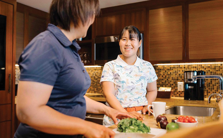 「広いキッチンがあって、とても重宝しますね。競技仲間にもHGVリゾートでの滞在をすすめたいくらい。ここザ・グランドアイランダーだけでなく、HGVは世界各地に素晴らしい施設があるとお聞きしています。特にマーク・ワンさんがおすすめしてくださったのが沖縄のザ・ビーチリゾート瀬底・ヒルトンクラブ。いつかはまとまった休暇を取ってリゾート気分を味わい、近くのゴルフ場でプレーを楽しんでみたいと思っています」