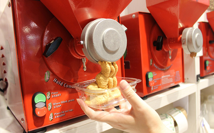 自分でボタンを押し、好きな量だけカップに入れて最後にお会計をします。その場で絞り出されるピーナッツバターは、この上なくフレッシュ!ぜひ、お試しください。その際、自分が選んだのがどの種類か、ラベルを貼っておくのをお忘れなく。