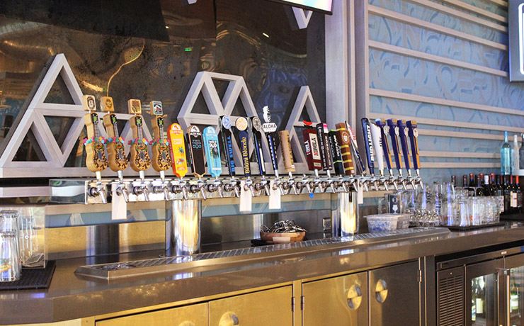 バーカウンターの中には、クラフトビールのタップがずらり。ホノルル・ビアワークスやワイキキ・ブルーイング・カンパニーなど、話題の地ビールがあれこれ試せます。