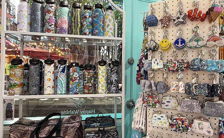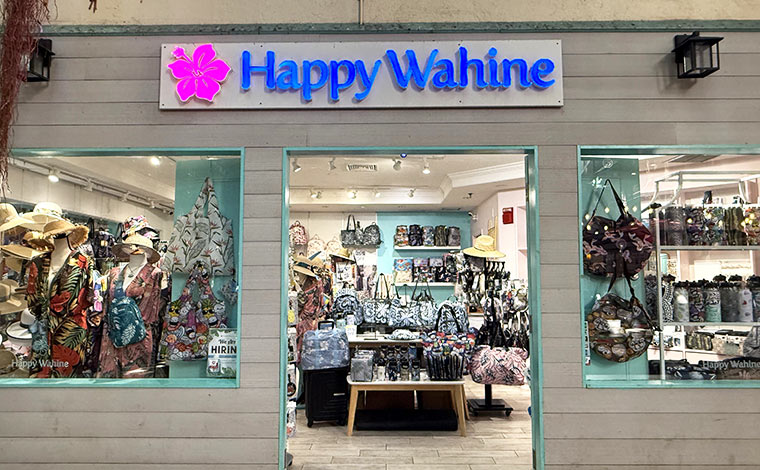 ハワイらしいデザインのバッグやポーチ、キーホルダーが揃う「ハッピー・ワヒネ」。ウルやカロ、ハイビスカス、ホヌ(カメ)、ジンジャー、シェイブアイス、パイナップルなど、ハワイを感じるデザインが魅力です。「ハッピー・ワヒネ」という店名は「幸せな女性」を意味し、仕事にもプライベートにも使いやすい色合いやデザインが人気の理由です。