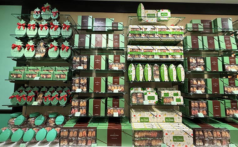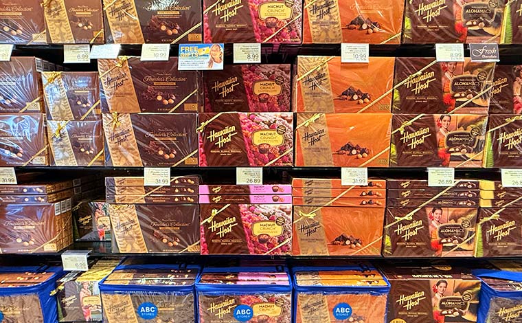 店内には、マカダミアナッツにチョコがコーティングされている、チョコレートホールマカダミアナッツ(10.95ドル~)をはじめ、ハワイ島のハマクア・トフィー・カンパニーのハワイアン・マカダミアナッツ・バタートフィー(20.95ドル)、ハワイ島で手作りしているバームクーヘン(23.95ドル)なども販売しています。