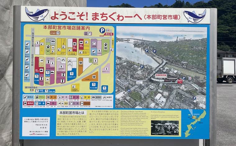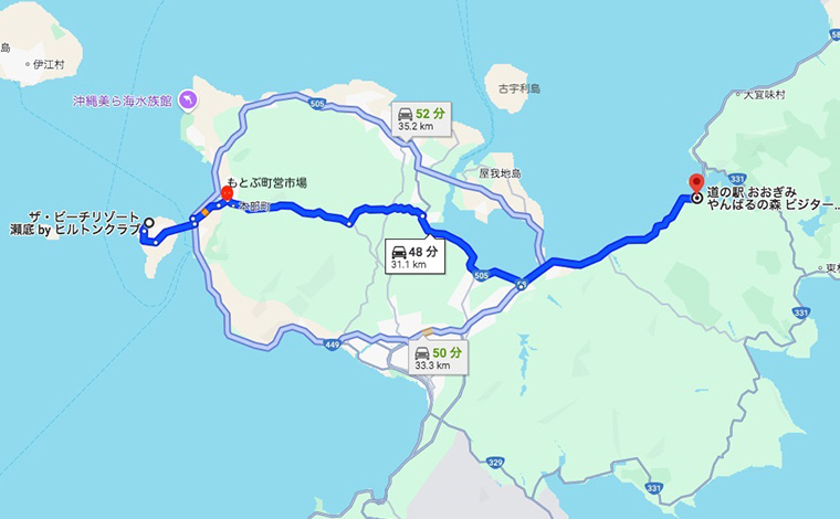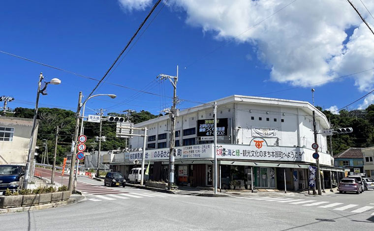 瀬底島のザ・ビーチリゾート瀬底・ヒルトンクラブを出発し、瀬底大橋を渡って左折し、大浜を右折して進むと、約15分程でもとぶ町営市場前の交差点、渡久地に出ます。
